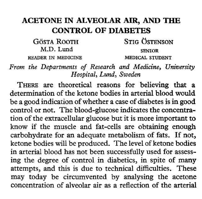 The history of using breath acetone to determine human ketone levels goes back almost 100 years. Erik Widmark published the first description of methods to measure acetone in alveolar air (the lungs) as well as studies on blood and urine (Widmark 1920b, 1920a, 1919). In this study, the authors successfully demonstrated a method to accurately measure acetone in the breath of patients with diabetic ketoacidosis.